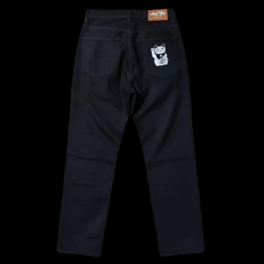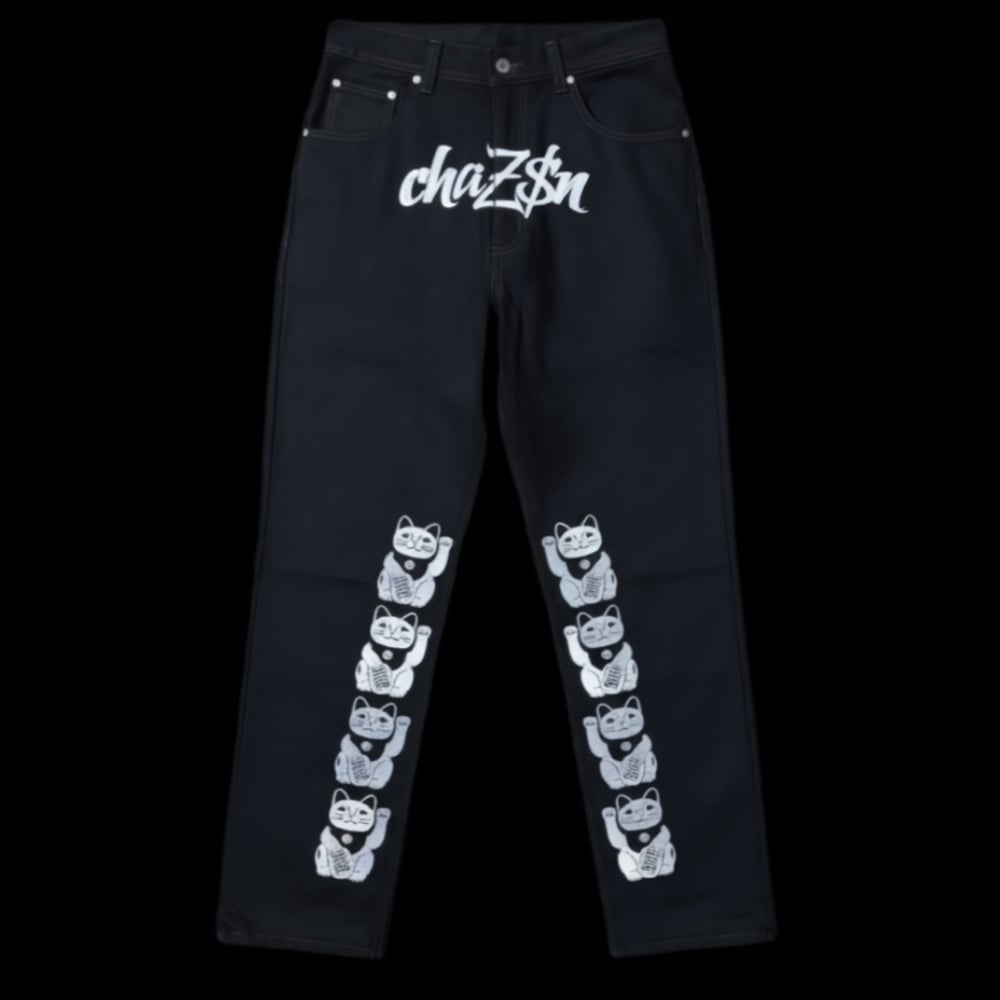 Elevate your street wear game with the Chaz$n Lucky Cat Jeans. Rooted in Los Angeles culture, these black denim jeans fuse a classic silhouette with bold, symbolic design.